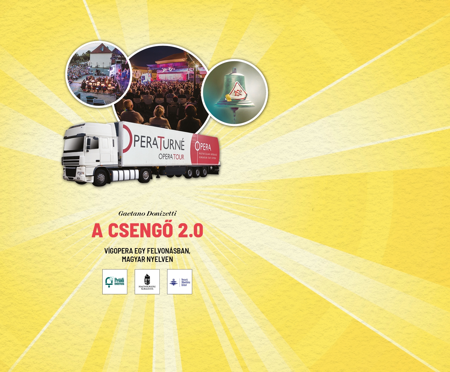 Mit tegyünk, ha épp egy szerelmes éjszakai órán megszólal a csengő? Aztán még egyszer megszólal, és még egyszer, és még egyszer? Gaetano Donizetti a rá jellemző bravúros humorral tárja elénk ezt a kínos helyzetet, és megmutatja, hogyan lehet némi furfang és álruha segítségével a nemkívánatos férjet távoltartani hitvesi ágyától. A csengő című Donizetti-vígopera a nápolyi Teatro Nuovo színház egy különösen nehéz időszakában született. 1836-ban mutatták be, amikor is a zeneszerző – és ezesetben egyben szövegíró – a színház igazgatójának és művészeinek szeretett volna segíteni a kolerajárvány és az anyagi gondok okozta nehézségekben. Ez sikerült is, ráadásul új műve pillanatokon belül hihetetlen népszerűségnek örvendett szerte Európában. Az évek során történtek változások a darabban, például az eredetileg prózai dialógusokból recitativók lettek, és a rendkívül komikusnak ható, ám kevéssé érthető nápolyi dialektust, melyet a buffó szereplő beszélt, a komponista engedélyével „lefordították” olaszra. A Gördülő Opera turné keretében látható produkció Toronykőy Attila, az OPERA rendezőjének elgondolása szerint készült.
