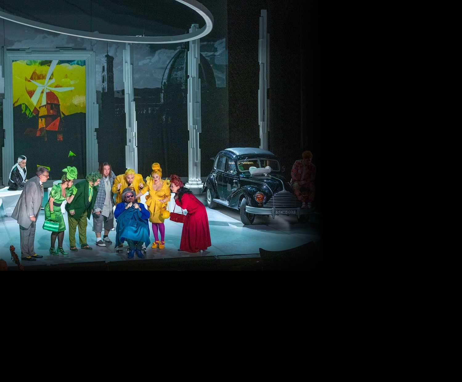Ebben az értelmezésben a dúsgazdag Buoso Donati főleg vastag pénztárcájáról híres. A környezet, ahol él, megidézi a középkor és a reneszánsz világát, de közben felismerhe­tően mai. Az öszvér és a malom „kortársiasítása” szokatlan, új megoldásokat szül a szín­padon. Egy olyan típusú ember, mint a mi Donatink, sokkal kézzelfoghatóbb, látványosabb értéktárgyakba fekteti a pénzét. Hogy pontosan mibe, az kiderül az előadásból, de a min­denre elszánt rokonok motivációja is érthetőbbé válik: olyan dolgokat kerestünk, amiért sokan lennének hajlandóak szinte bármire. A rendező szeret világos viszonyokat teremteni a színpadon, így amíg Puccininél Donati már halott, amikor a rokonok betoppannak, az új produkcióban megjelenik még életében. Ez azonban megbolygatja a dramaturgiát, hiszen a halott felöltöztetését és ágyba fek­tetését – ami sok Gianni Schicchi-előadás leghumorosabb pillanatait hozza – újra kel­lett gondolni, így például Buoso Donati ágy helyett hatalmas íróasztala mellől diktálja a végrendeletét.